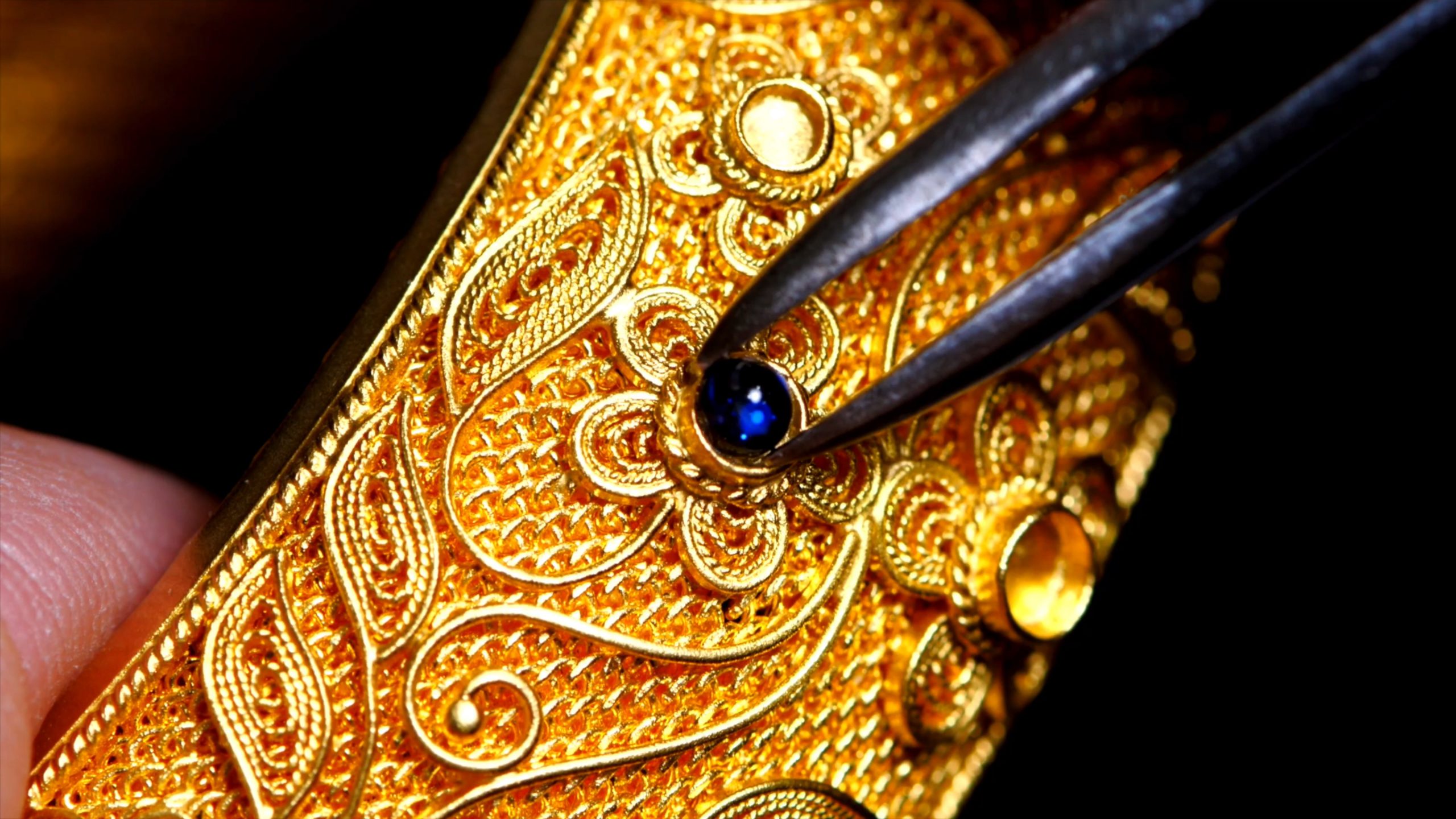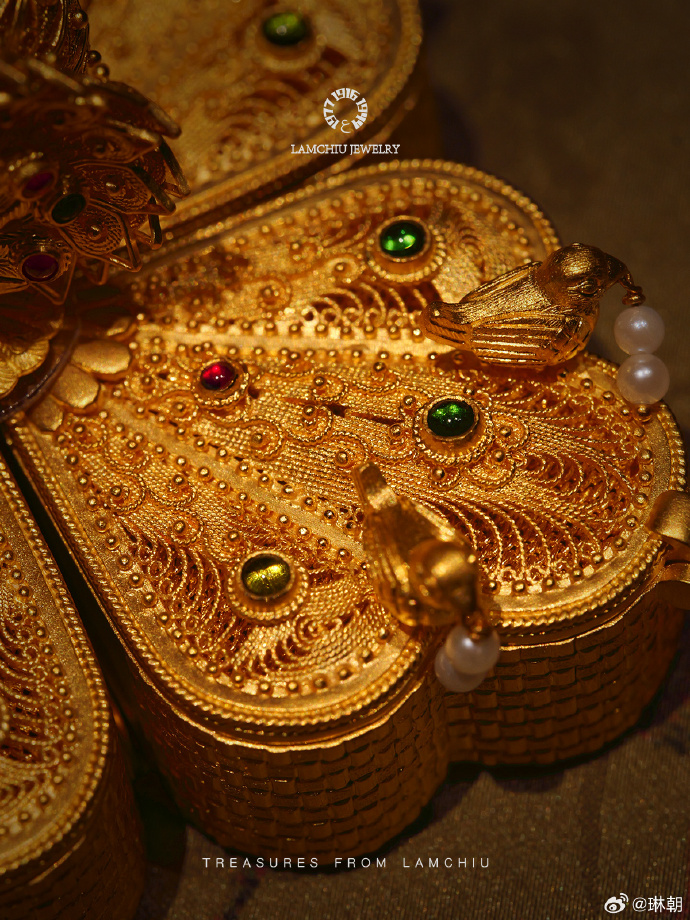像金雕工艺,我们将其和中式珠宝融合到一起。我们更是把全世界所有国家的花丝工艺结合到了我们中式珠宝里。