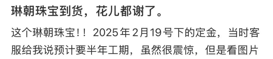 付了定金后,就是漫长的等待。10克左右的小吊坠,工期也是半年起。有人在等待半年后,卑微寻问客服,“什么时候可以付尾款”,才发现工期延长了。