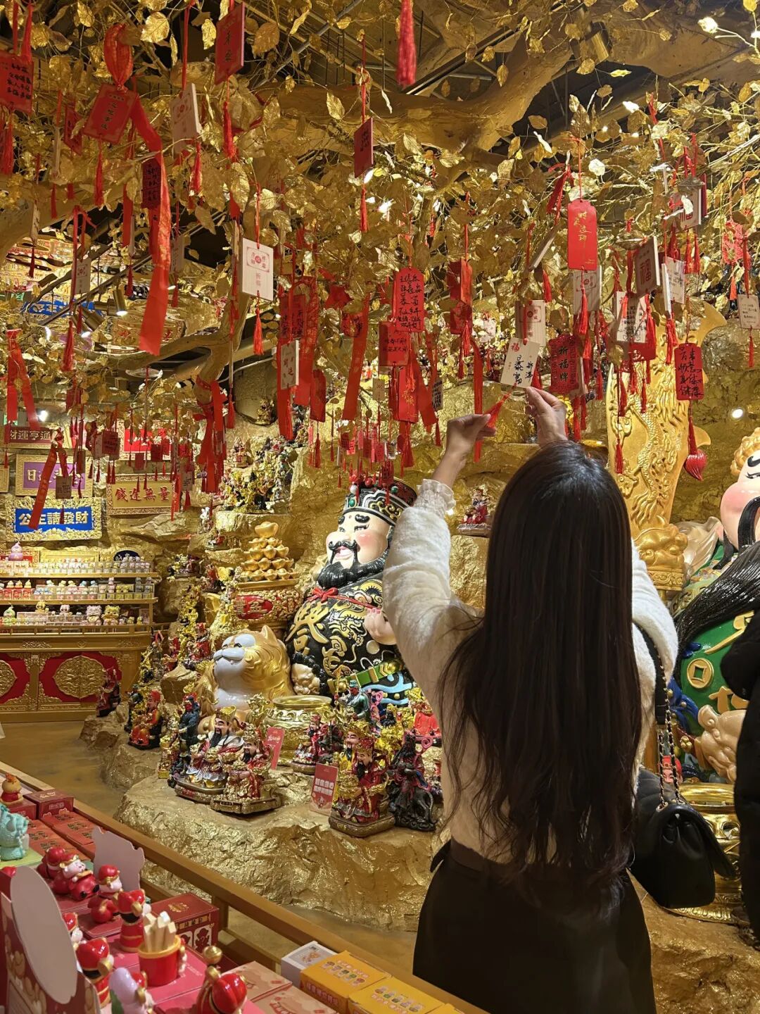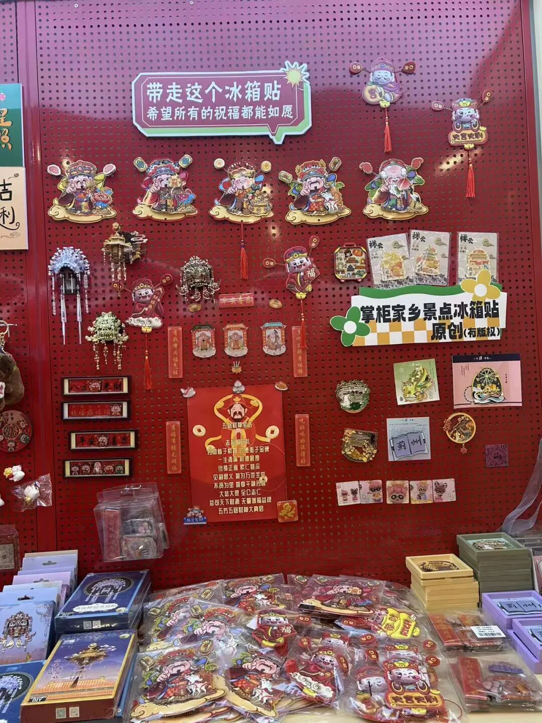 王泽觉得很好玩,顺手抓起两张功德盆里的纸币便与财神像合影,在拍下几十张照片后,他才开始审视店内真正的「正菜」——那些承载着好运寓意的小物件。